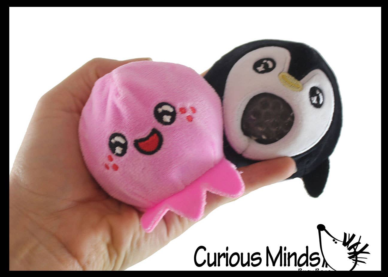 SET OF 1 RANDOM ANIMAL BALLS - These sea animal stress balls are so adorable. They come in 6 ocean animal styles including, dolphin, penguin, octopus, seal, clownfish, and shark. These stress balls are unique because the outside layer of the ball is soft plush fabric material. They are a pliable squishy soothing sensory ball filled with a bunch of thick colorful water bead gel balls inside its elastic flexible skin. The colorful animal skin is so soft. When you squeeze the animals, the jelly beads push out and around making the ball bulge and it makes it look like it is blowing a bubble. It is very soothing to feel the little gel beads, and it also makes a soft swishing sound to add to the sensory experience. 2.5" ball. These are nice because they protect the ball from being twisted or jabbed with fingernails so it makes them a little more durable for occupational or therapy settings. If the internal ball breaks you can add a new one.