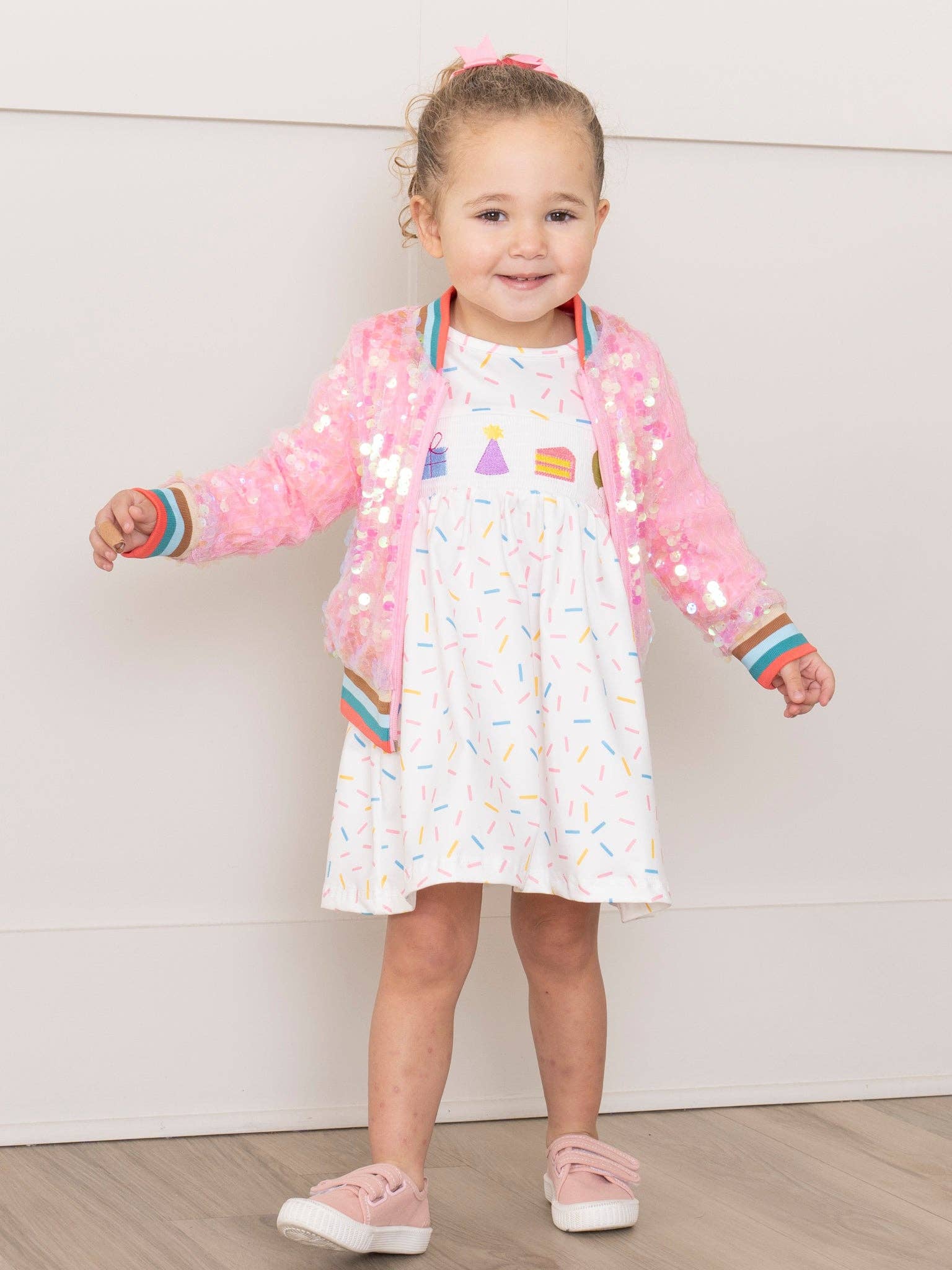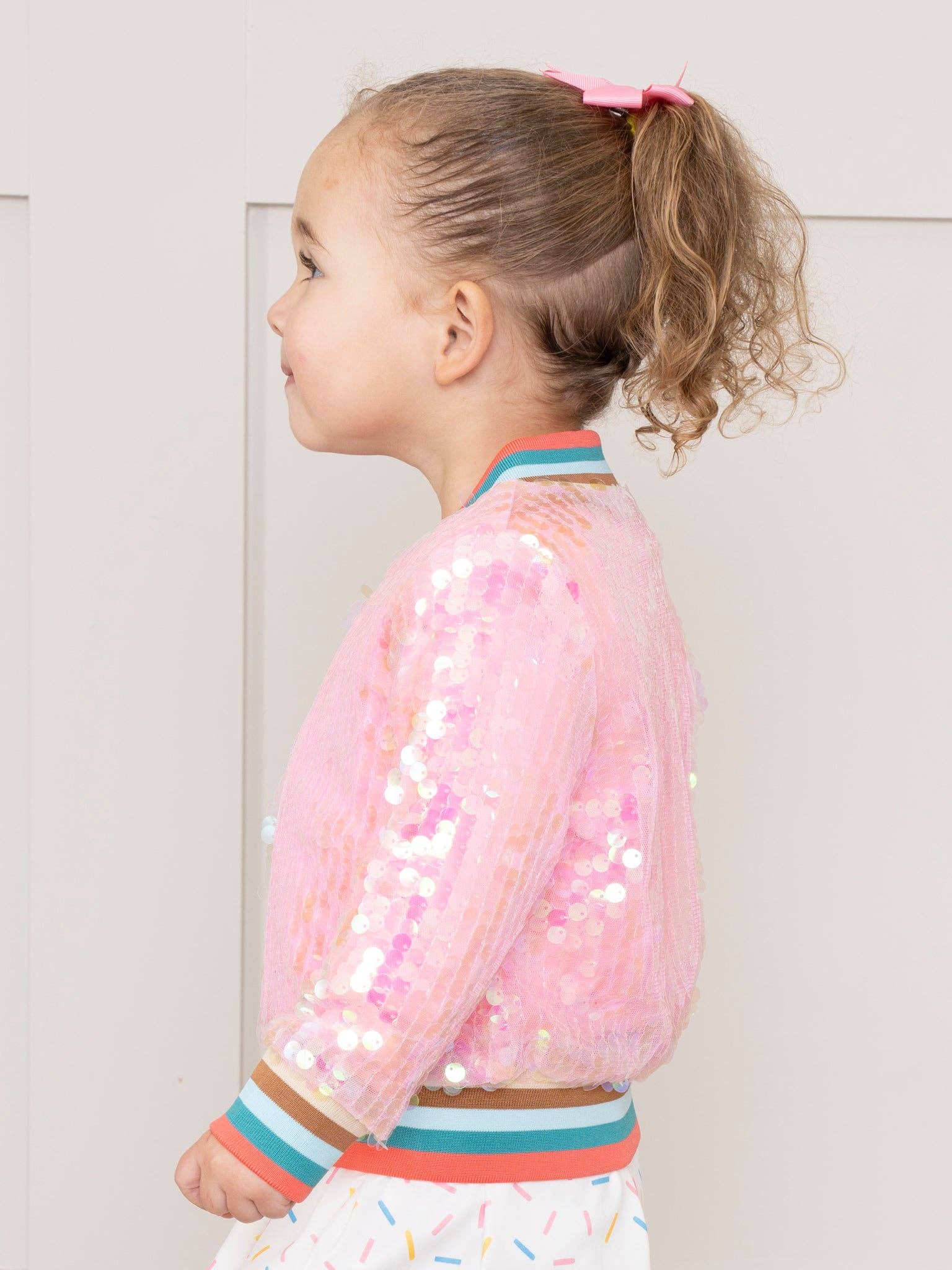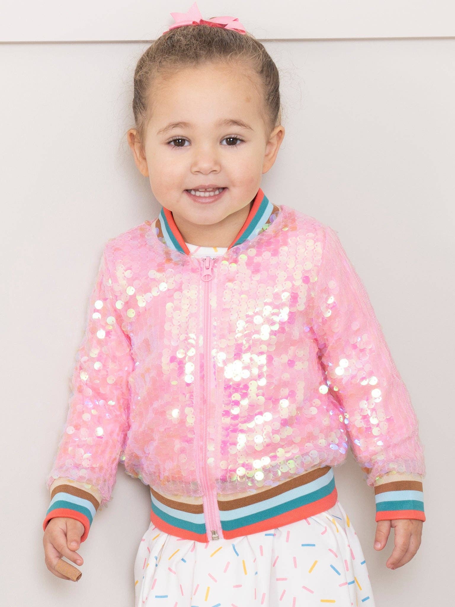 Sparkle and Shine in this adorable sequin bomber jacket featuring a full zipper front, white sequins, and a striped jersey banded collar and waistband.