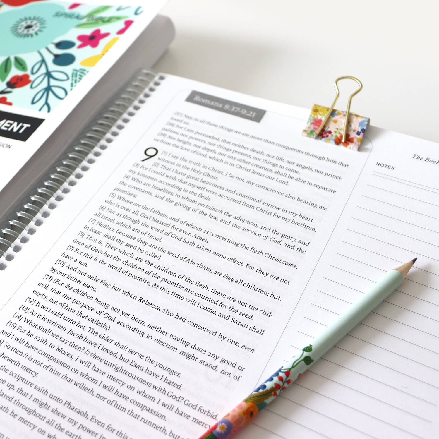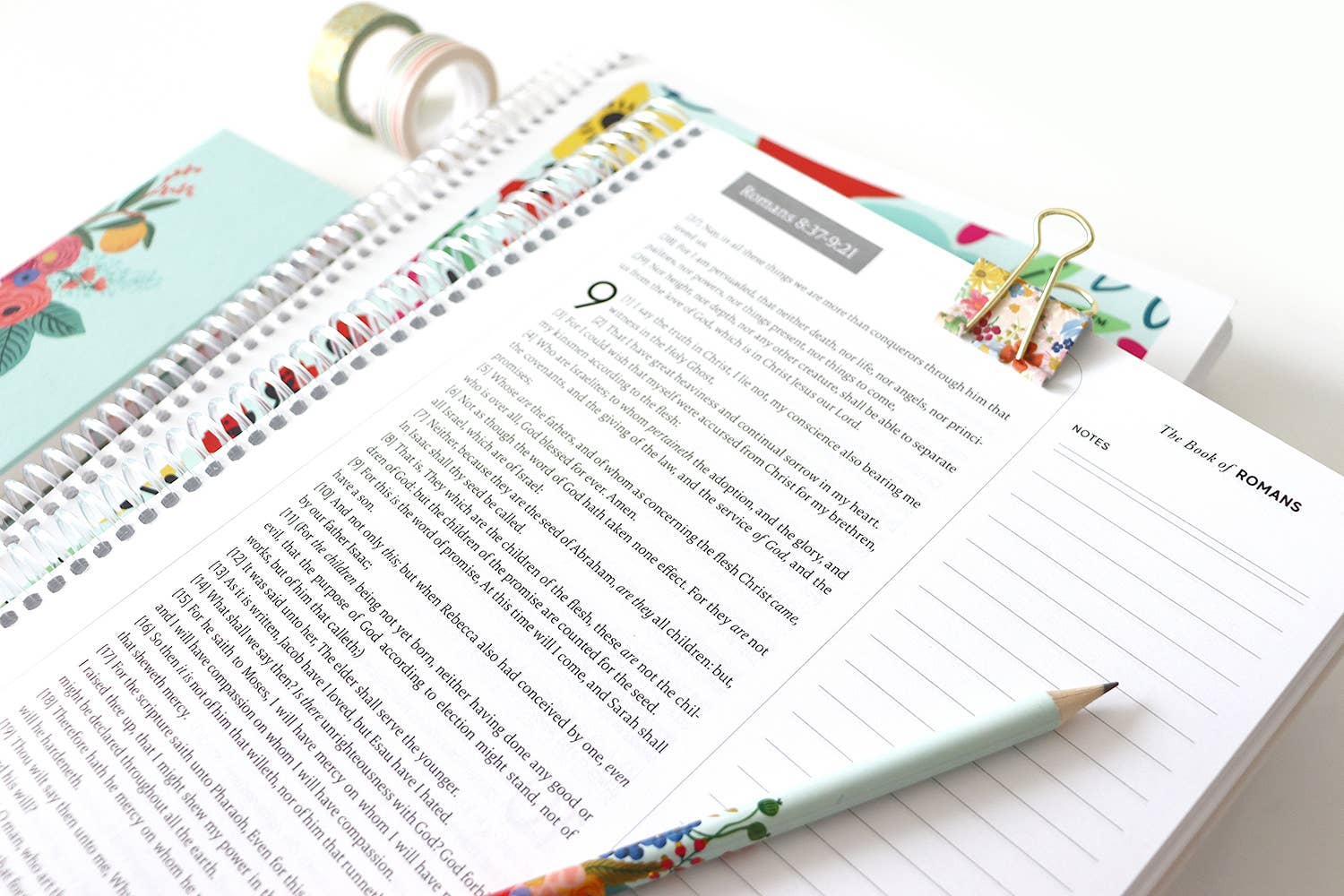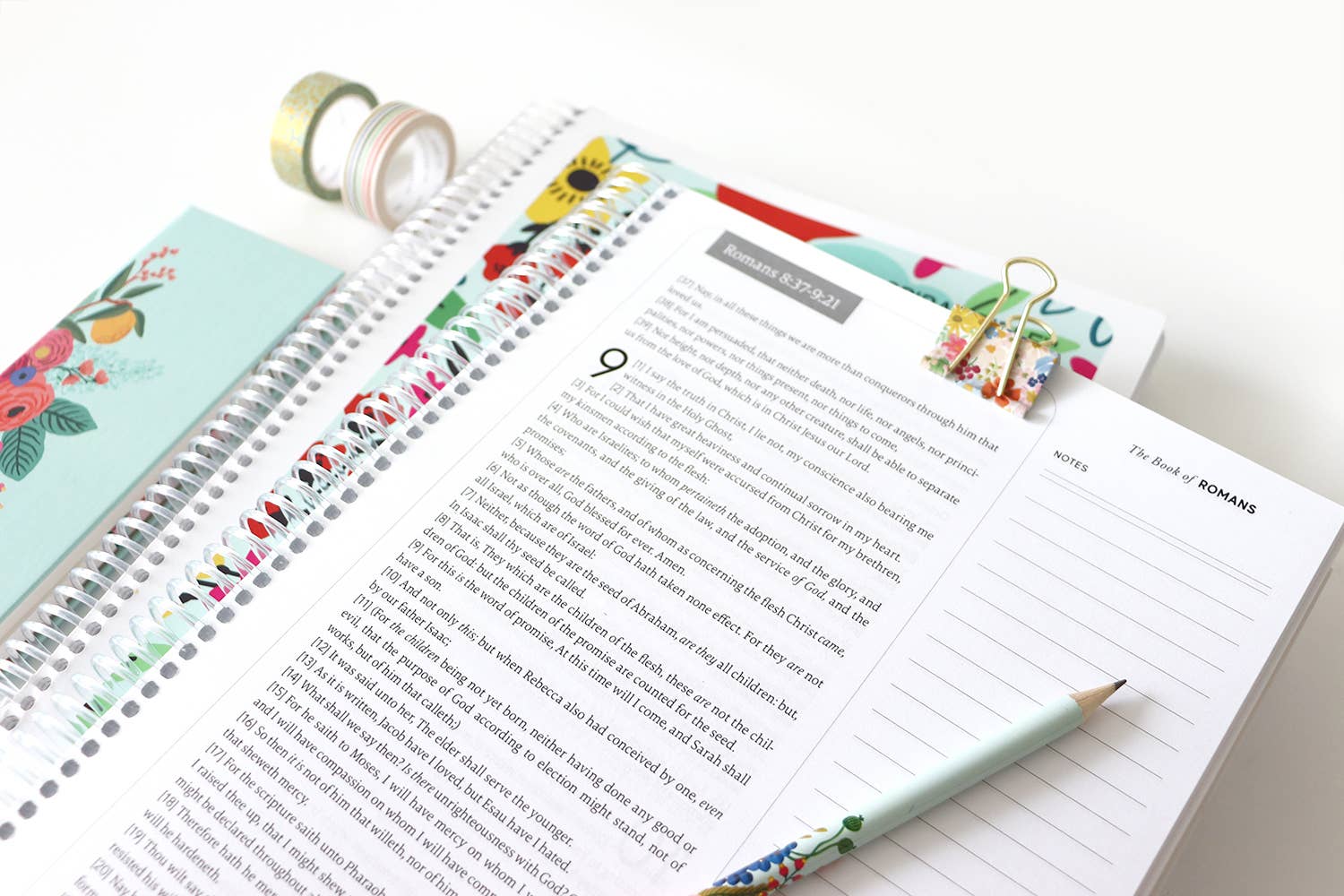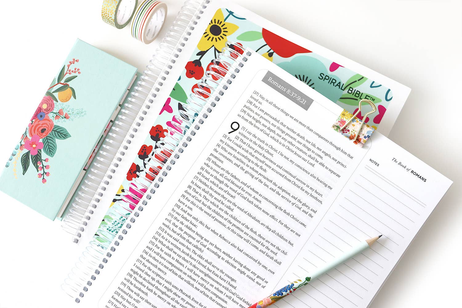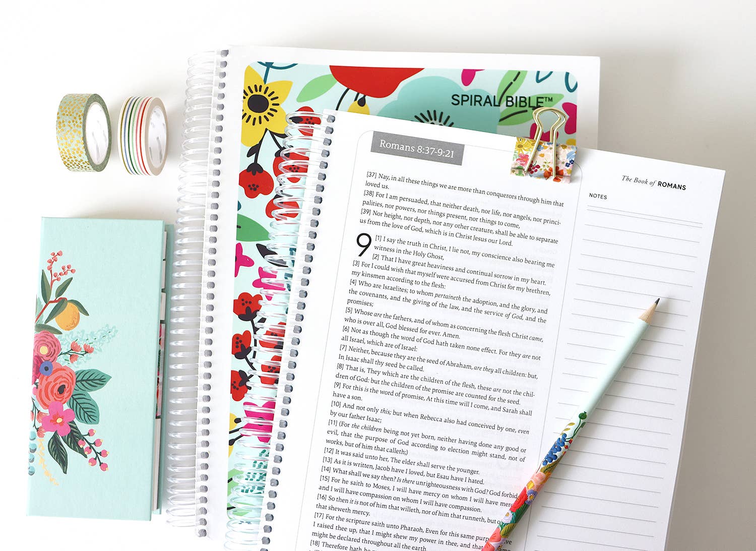 You'll find this Spiral Bible notebook to be the perfect notetaking Bible with wide margins, and plenty of space for Bible illustrating. Use this spiral bound journaling Bible for your daily Bible reading, Bible study, or to house your Bible notes. This beautiful floral Bible also allows you to learn more from God's Word. It's the Word of God for notetakers. Grab your (King James Version) KJV journaling Bible today! Including: ---The entire New Testament ---King James Version (KJV) ---8.5 x 11 pages with spiral binding ---Double-wide margins for note taking ---A large 10 pt font for easy reading ---Durable 50# white notebook paper ---Free shipping within the United States! Made in the USA. Lay it flat and mark it up!